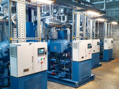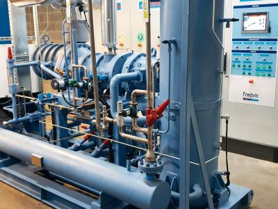 Es tracta d'una nova instal·lació d’alta eficiència d’amoníac (NH3) amb compressors SRM sobre bancades independents. Instal·lació centralitzada amb aspiracions independents i descàrrega comuna.